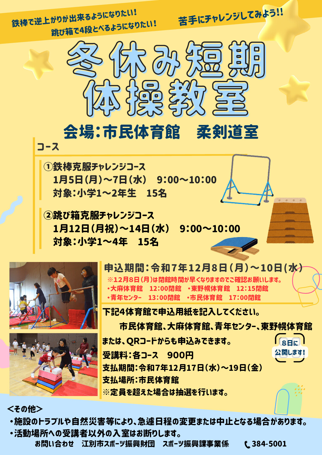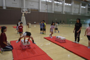 子どもたちの体力向上を目的に、体操種目(鉄棒・とび箱)にチャレンジする短期体操教室を開講します。