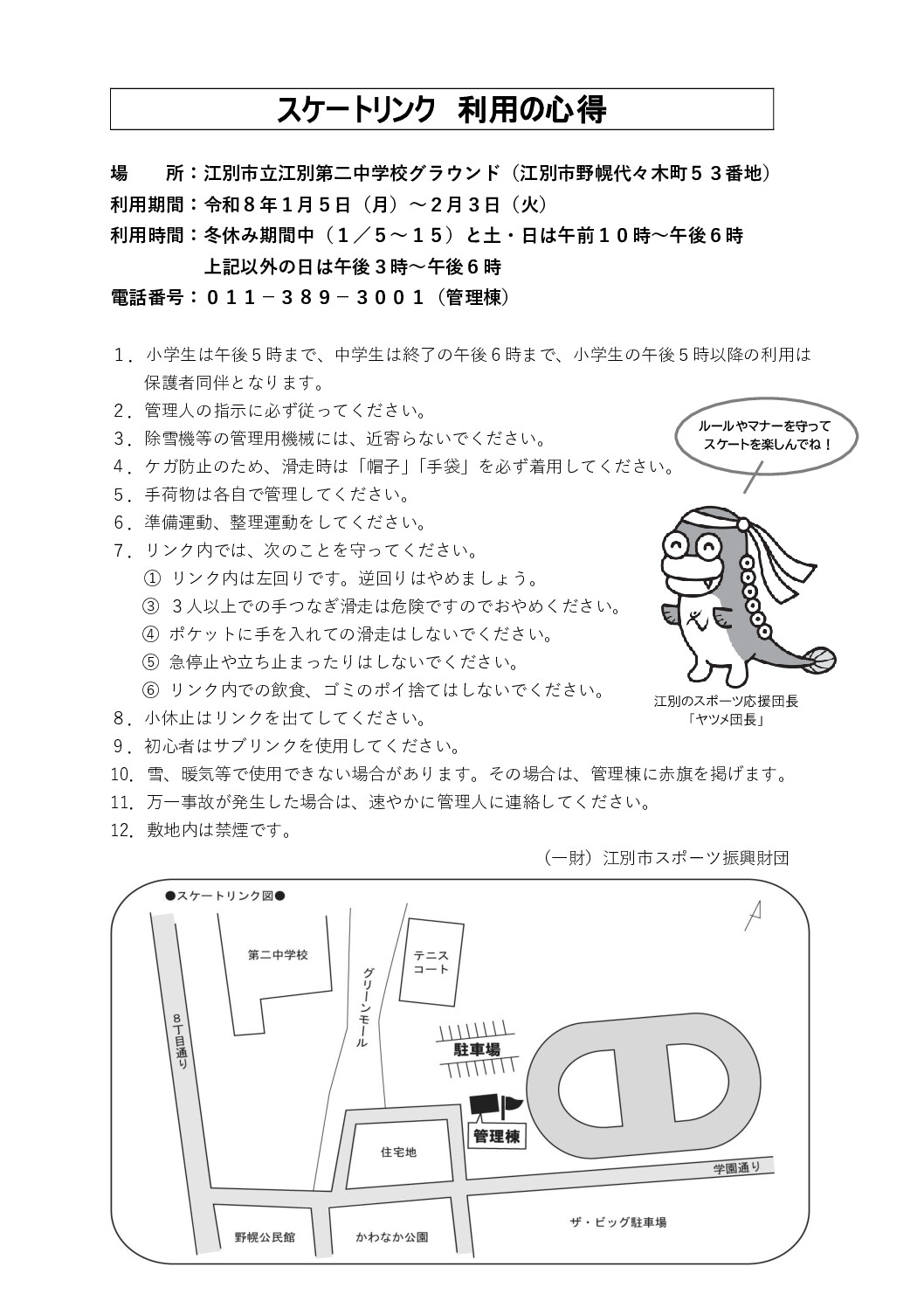 ◆注意事項:降雪や暖気等でリンクが使用できない場合は管理棟に赤旗を掲げます。帽子、手袋は必ず着用してください。